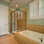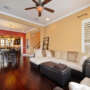 The kitchen opens seamlessly to the dining and living rooms, which feature classic plantation shutters, a cozy fireplace, wood flooring, and 10-foot ceilings.