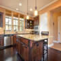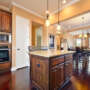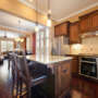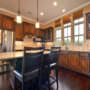 The kitchen is equipped with two ovens, a gas cooktop, stainless steel appliances, a large center island with seating, 42” oak cabinets, including those with glass fronts for your display items.